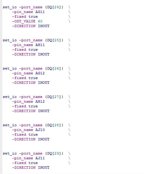 (Ask a Question)When the I/O assignment is committed and saved in the I/O Editor, the assignment is saved in a PDC file in the <project_folder/constraints/io/user.pdc> file. The PDC file contains set_io commands on each of the DDR Memory Interface I/O.