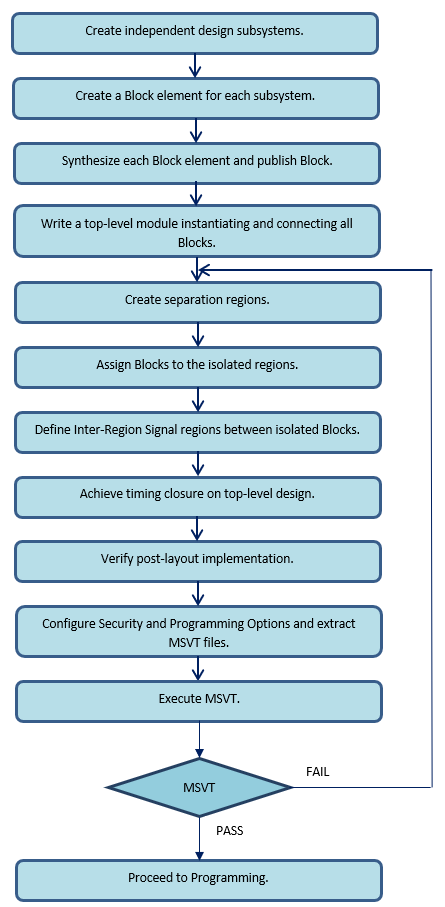 The Design Separation methodology leverages an existing design methodology referred to as a “Block flow” to achieve isolated functions. Block flow is a bottom-up design methodology that allows an incremental design approach. In a Block flow compile, component modules in a design are compiled and optimized in independent stages from the rest of the project. After compiling, the component modules are published as a netlist (or “Block”), and then imported to a top-level project for integration with other modules in the larger system design.