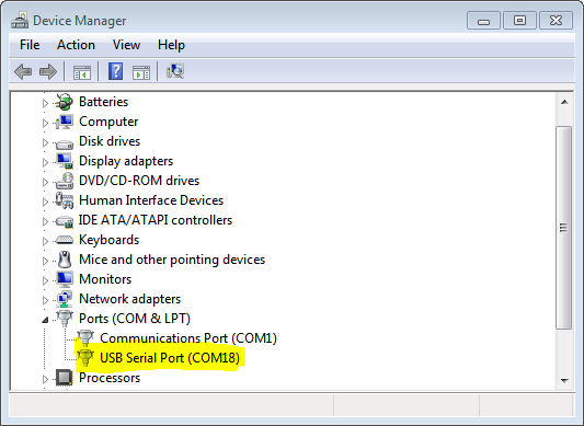 If the COM port to choose is not known, it can be located in the Windows Device Manager in the Port (COM and LPT) section. In this example, the COM18 is used: