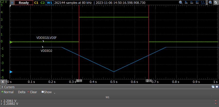 VDDIO2 supply voltage was ramped up and down between 0V and 3.3V, and the