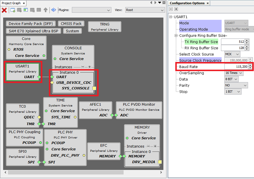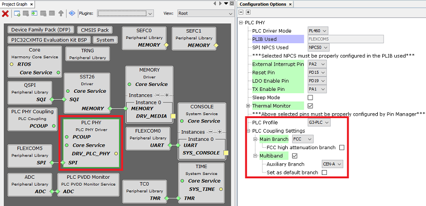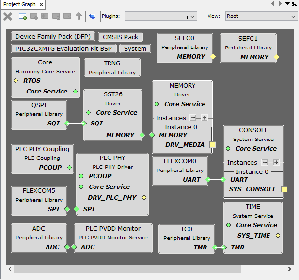 The following figure shows the MCC project graph of PLC PHY Tx Test Console application for PIC32CXMTG-EK.