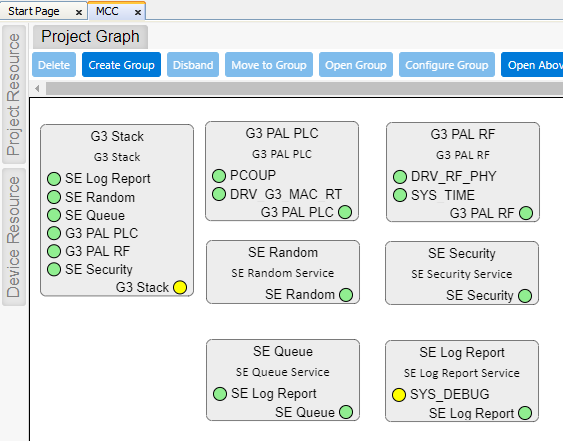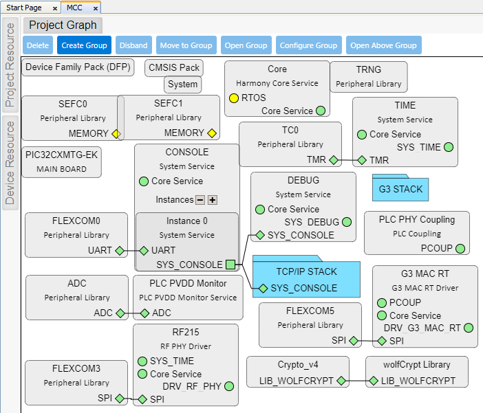 The following figure shows the MCC project graph of G3 Coordinator ICMPv6 Cycles application for PIC32CXMTG-EK.