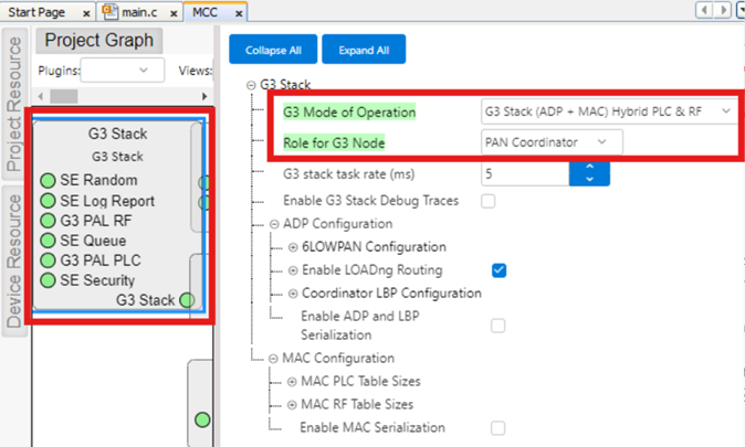 - Since it is an hybrid project, both PLC and RF G3 PALs are present. For PLC-only or RF-only projects, only one of them is needed (G3 Mode of Operation should be changed in MCC options of G3 Stack).