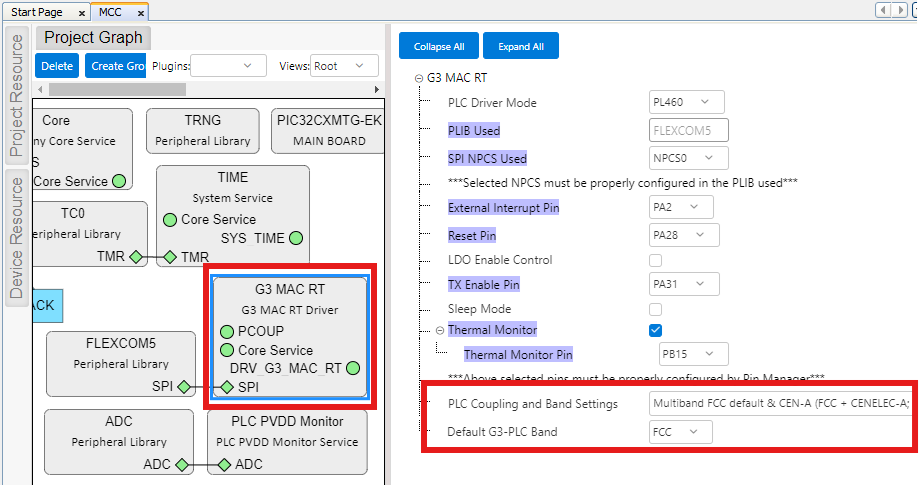 The G3 Coordinator ICMPv6 Cycles application loads by default the configuration to use the default coupling stage of the evaluation kit (Multiband FCC + CENELEC-A for the PL460-EK). If other PLC band configuration is required, it can be easily modified in the MCC options of G3 MAC RT driver, as shown below.