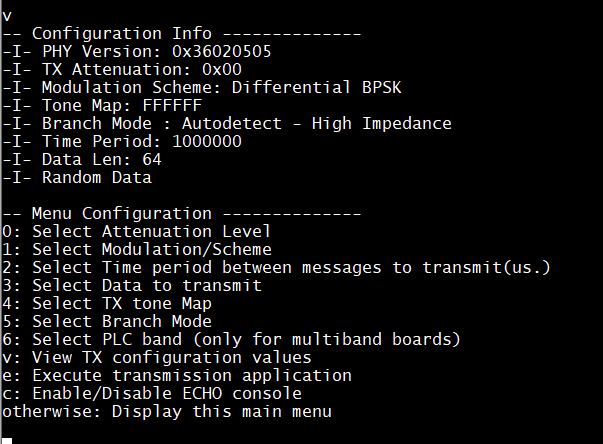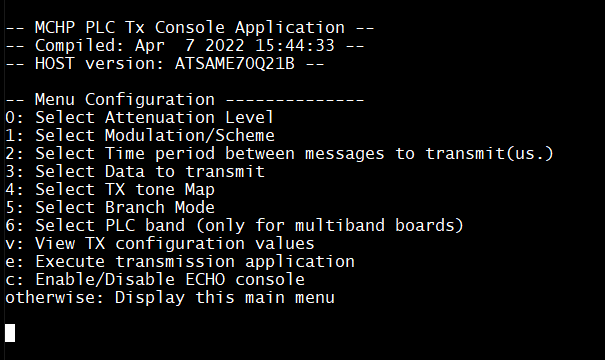 The PLC PHY Tx Test Console application offers an interface to the user by means of a command line console. In this console, the user can configure several transmission parameters, such as attenuation level, modulation, frame data length, and time interval between frames. The following figure shows the console configuration menu.
