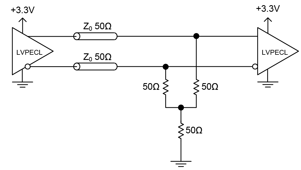 LVPECL output currents are typically 15mA and derived from an open emitter or FET source-drain outputs. This requires termination into a resistive load to produce a voltage. The intent for LVPECL is to use a 50Ω impedance trace and 50Ω thevenin equivalent load. This is usually implemented using Figure and an alternative scheme is shown in Figure . For best performance, the outputs should be equally terminated using the same method; an unused output should never be left floating. Also, differential receivers from different manufacturers can have different input tolerances (while still clustered around a common standard). Doing some homework on the requirements of the receiver can also help to optimize the transmission of the signal you are looking to terminate.