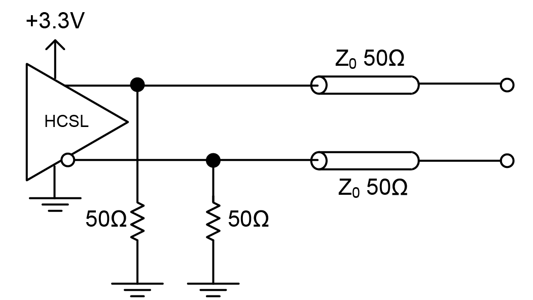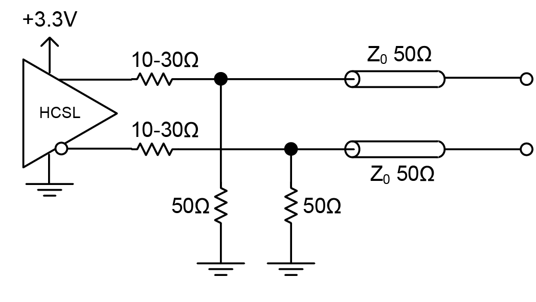 High Speed Current Steering Logic (HCSL) outputs are found in PCI Express applications and Intel chipsets. HCSL is a newer differential output standard, similar to LVPECL, with a 15mA current source that is derived from an open emitter or source. Being un-terminated drains, they require external 50Ω resistors to ground as shown in Figure . HCSL is a high impedance output with quick switching times; it can be advantageous to use a 10Ω to 30Ω series resistor, as shown in Figure , to help reduce overshoot/ringing. HCSL provides the quickest switching speeds, power consumption is somewhere between that of LVDS and LVPECL, and phase noise performance compares well with the alternative technologies. As always, it is best practice to understand a receiver’s input structure.