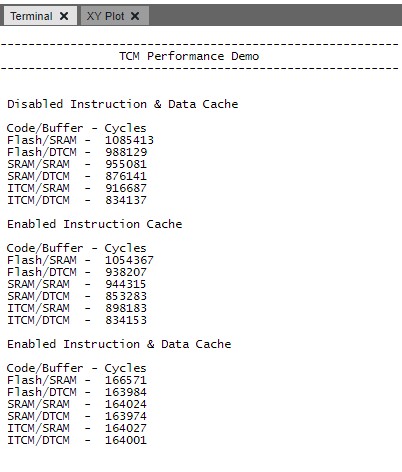 The application demonstrate code execution from various memory locations and compares the time taken to execute the code from Flash memory, SRAM, and TCM with and without the Instruction Cache and Data Cache. The result is displayed MPLAB Data Visualizer Serial Console.
