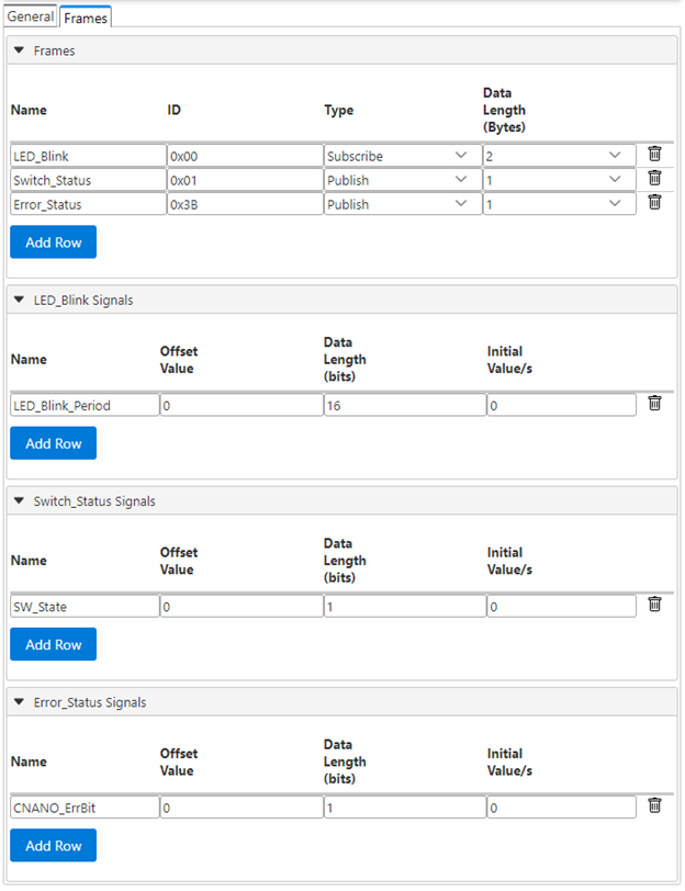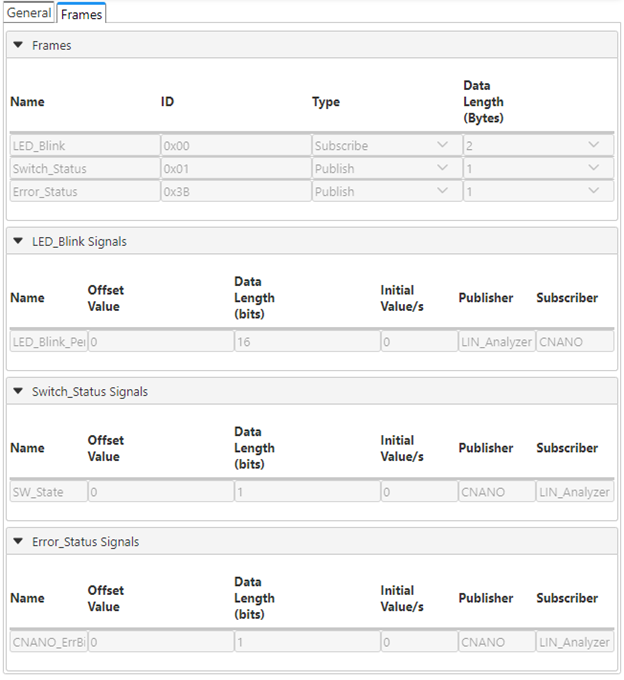 In the LIN Responder GUI, go to the Frames tab and add the following signals and frames: