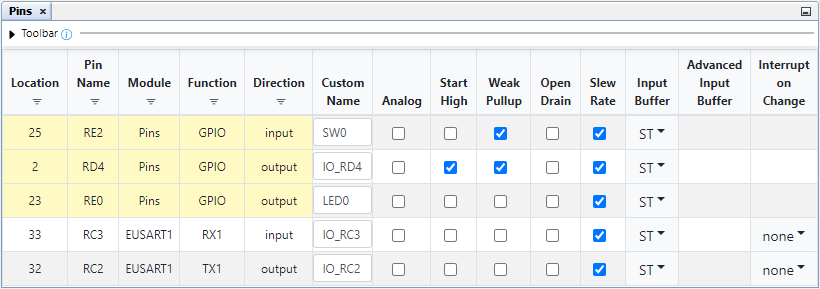 main.cfile and add the following code:#include "mcc_generated_files/system/system.h" /* Main application */ void LED_BlinkPeriodSet(void); void SW_StatusRead(void); void LED_Toggle(void); void Timer_Stop(void); uint16_t blinkPeriod = 0; uint16_t counter = 0; int main(void) { SYSTEM_Initialize(); // Enable the Global Interrupts INTERRUPT_GlobalInterruptEnable(); // Enable the Peripheral Interrupts INTERRUPT_PeripheralInterruptEnable(); LEDBLINK_AppCallbackRegister(LED_BlinkPeriodSet); LINRESP_ShortRespErrCallbackRegister(Timer_Stop); Timer1_OverflowCallbackRegister(LED_Toggle); while (1) { SW_StatusRead(); } } void LED_BlinkPeriodSet(void) { Timer1_Stop(); blinkPeriod = l_u16_rd_LED_Blink_Period(); counter = 0; Timer1_CounterSet(0); Timer1_Start(); } void LED_Toggle(void) { if(++counter == blinkPeriod) { LED0_Toggle(); counter = 0; } } void SW_StatusRead(void) { if (SW0_GetValue() == HIGH) { l_bool_wr_SW_State(0); } else { l_bool_wr_SW_State(1); } } void Timer_Stop(void) { Timer1_Stop(); }
