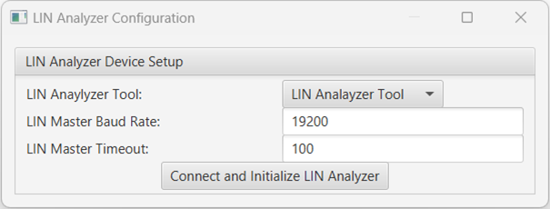 - Hit the Connect and Initialize LIN Analyzer button before closing the pop-up window. A “LIN Analyzer initialized” status is displayed in the footer of the main window.