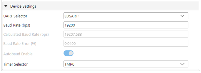 - Select EUSART1 as the LIN Responder’s UART and set the baud rate to 19200. The baud rate is already filled in and uneditable when an LDF is loaded.