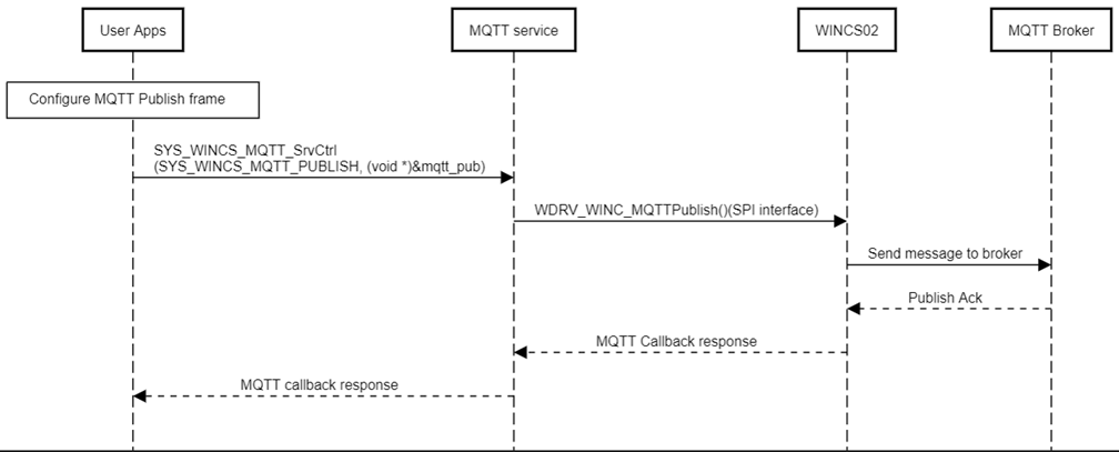 User application can publish to the MQTT broker by creating the MQTT frame and then sending the frame using the API. The sequence chart is illustrated below.