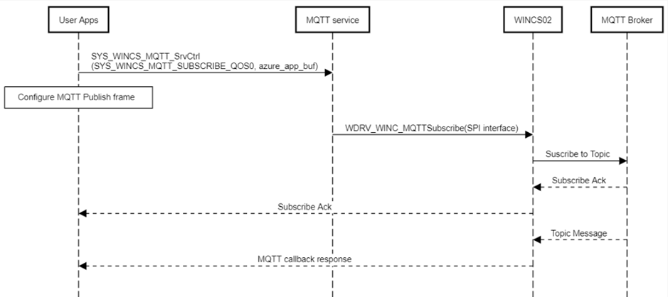 The sequence for subscribing to a topic from the MQTT Broker is illustrated below. The user application needs to use the API to subscribe to the topic with the appropriate QoS value.
