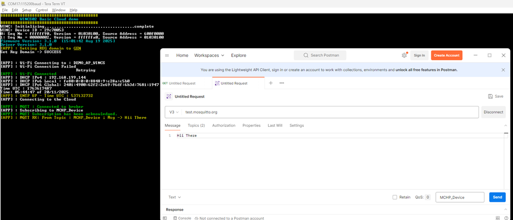 - To demonstrate successful MQTT connection, the board subscribes to topic mchp/sample/b and publishes a message on the same topic. The received message is printed in the terminal.