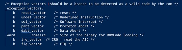 The ROM code reads and analyzes the first 28 bytes, corresponding to the first seven vectors of the second-stage bootloader (at91bootstrap in this case), to determine whether it can be considered as a valid boot code pattern or should be skipped.