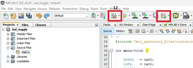 Important: The previous code shows the LED0 on pin 7 ofPORTC, verify what pin and port LED0 is connected to. This will be different depending on the used Curiosity Nano. - Build the code by clicking Production→Clean and Build Main Project or using the <Shift+F11> shortcut.