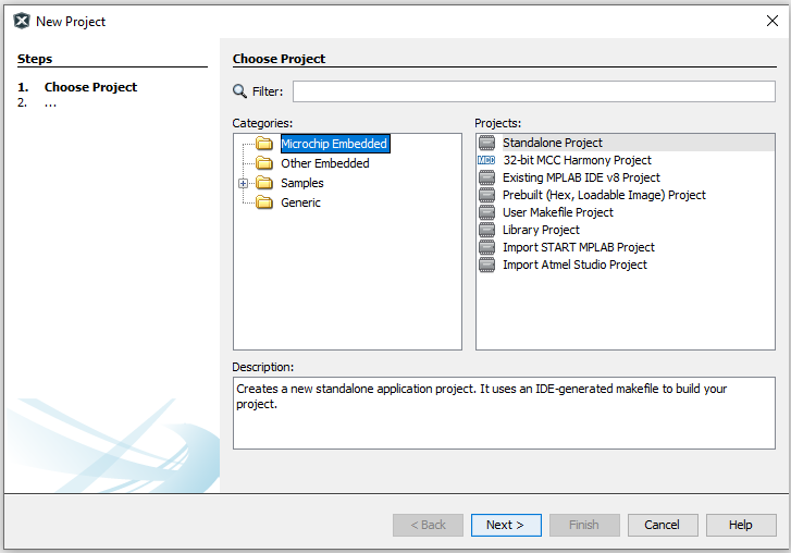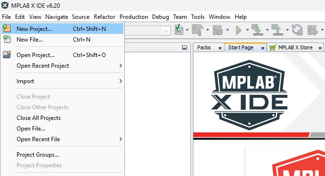main.cfile by clicking File→New File or using the <Ctrl+N> shortcut.Figure 3-7. Create a New File in MPLAB X