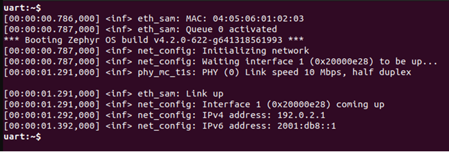 The Ipv4 address for the LAN8670’s network interface is already assigned using the prj.conf file.