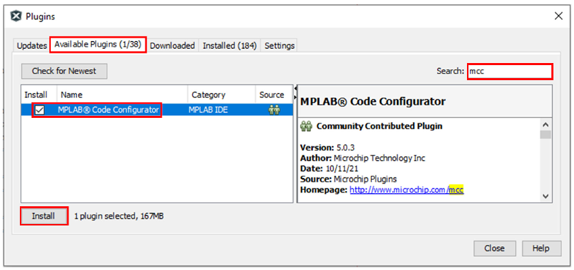 3. Select the checkbox next to the MCC plugin, and then click Install.