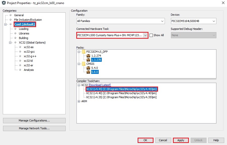 Figure 5-3. Project Properties - PIC32CM LS00 Curiosity Nano+Touch Evaluation Kit