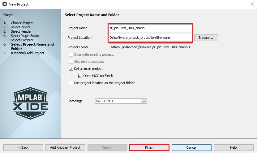 - Project Name: Enter tz_pic32cm_ls00_cnano (Indicates the project name that will be shown in MPLAB X IDE to set the project's name).