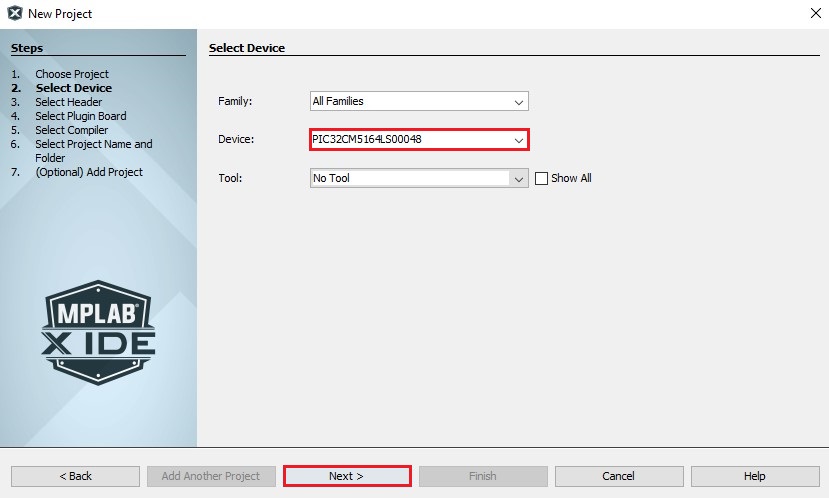 PIC32CM5164LS00048 to create the project on the PIC32CM LS00 Curiosity