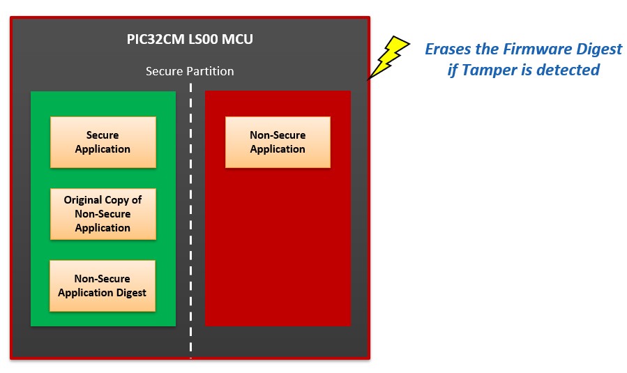 The PIC32CM LS00/LS60 family of devices features tamper detection with a tamper erase security function within the Real Time Clock (RTC) peripheral. To simulate a software attack, the tamper erase option is employed to erase data stored in the secure memory region. Upon detecting any tampering, the RTC peripheral within the secure application triggers a tamper-erase operation to delete the contents (firmware digest) in the Secure Data Flash region.
