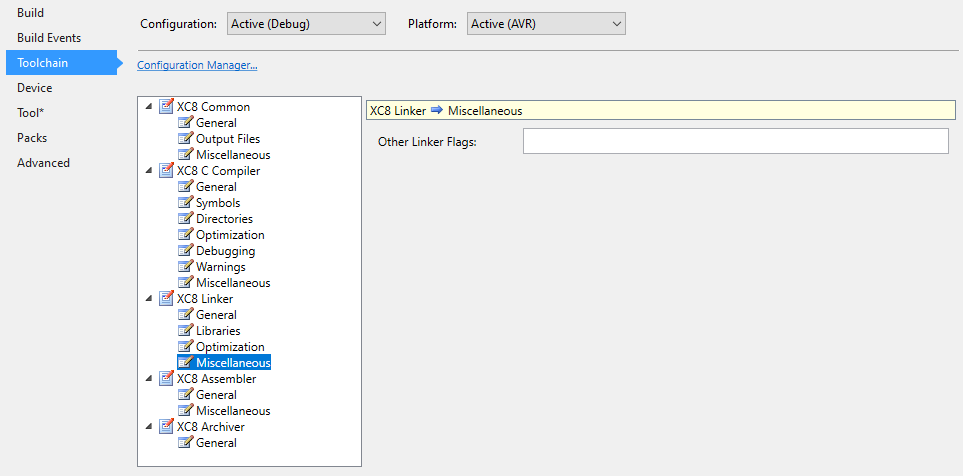 3.8.1.14 XC8 Linker - Miscellaneous Figure 3-23. XC8 Linker - Miscellaneous Other linker flags Enter additional options in this field to affect the link stage of compilation.