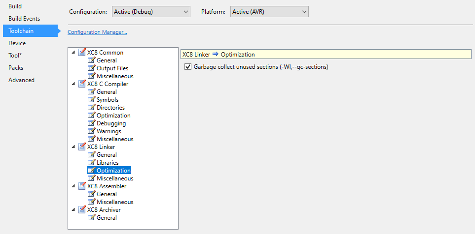 3.8.1.13 XC8 Linker - Optimization Figure 3-22. XC8 Linker - Optimization Garbage collect unused sections Select this checkbox to have unused sections removed from the program output. See Mapped Linker Options.