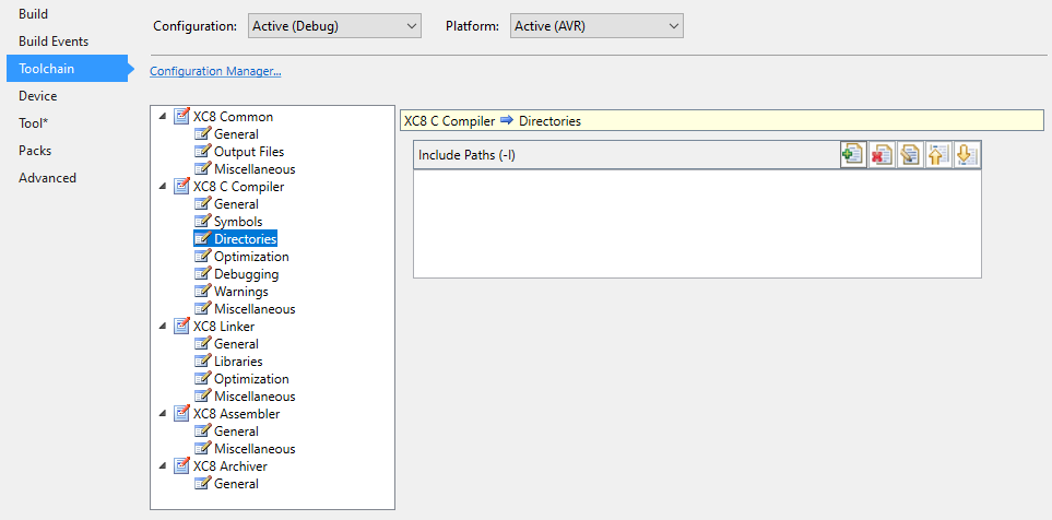 3.8.1.6 XC8 C Compiler - Directories Figure 3-15. XC8 C Compiler - Directories Include paths These controls allow you to specify search paths for include files. See I: Specify Include File Search Path Option.