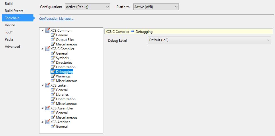 3.8.1.8 XC8 C Compiler - Debugging Figure 3-17. XC8 C Compiler - Debugging Debug level This selector controls the amount of debug information produced. See G: Produce Debugging Information Option.