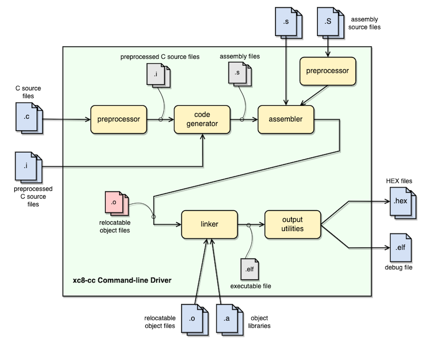 The large shaded box represents the compiler, which is controlled by the command line driver, xc8-cc. You might be satisfied just knowing that C source files (shown on the far left) are passed to the compiler and the resulting output files (shown here as a HEX and ELF debug file on the far right) are produced; however, internally there are many applications and temporary files being produced. An understanding of the internal operation of the compiler, while not necessary, does assist with using the tool.