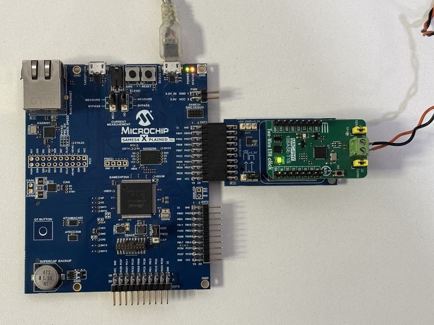 Insert the Two-Wire ETH Click board with the LAN8651 chip into the