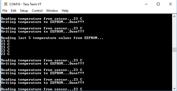 last 5 temperature values will be read from the EEPROM and displayed as shown