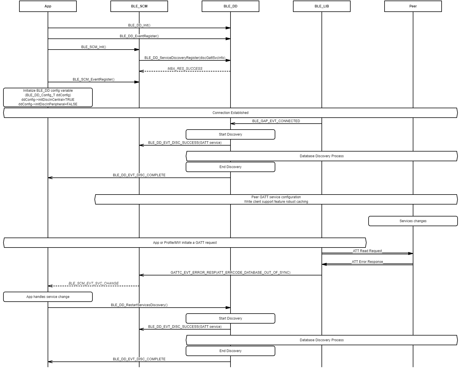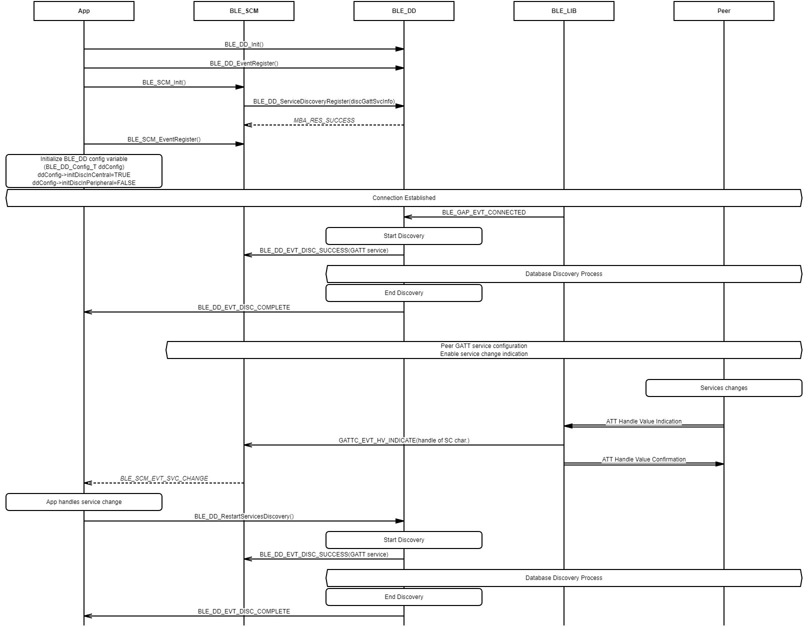 Database Discovery with BLE_SCM in Service Change Scenarios Example demonstrating receiving a service change indication from a peer. Example demonstrating receiving a service change indication from a peer.