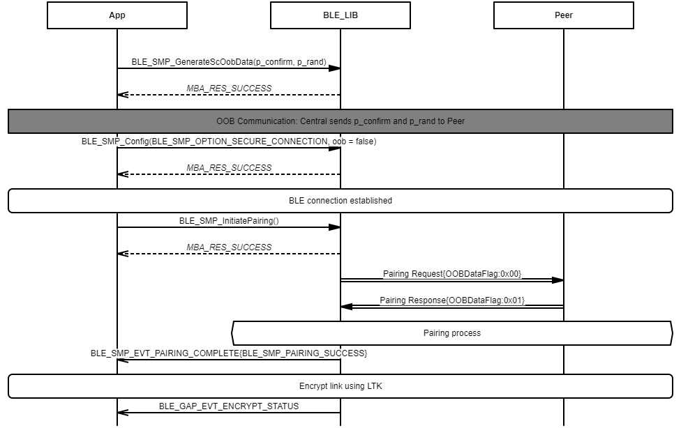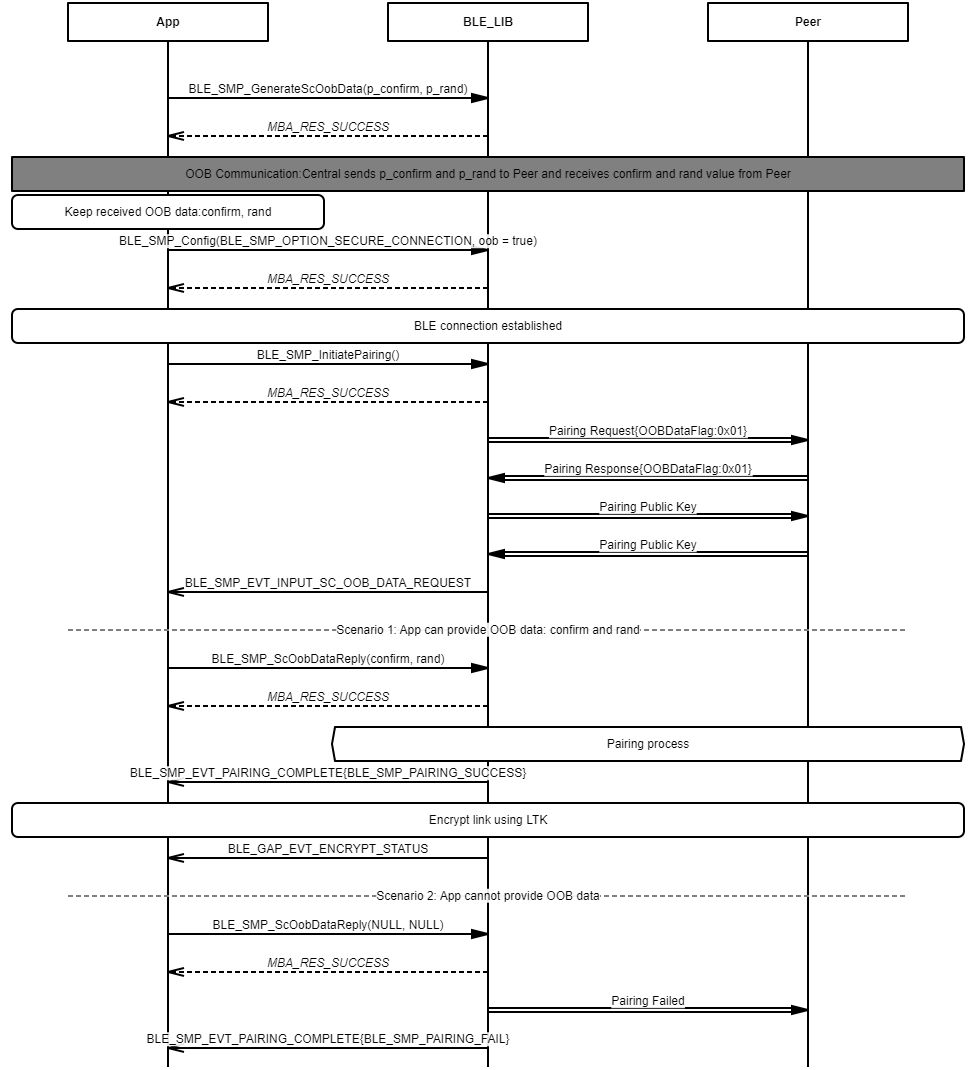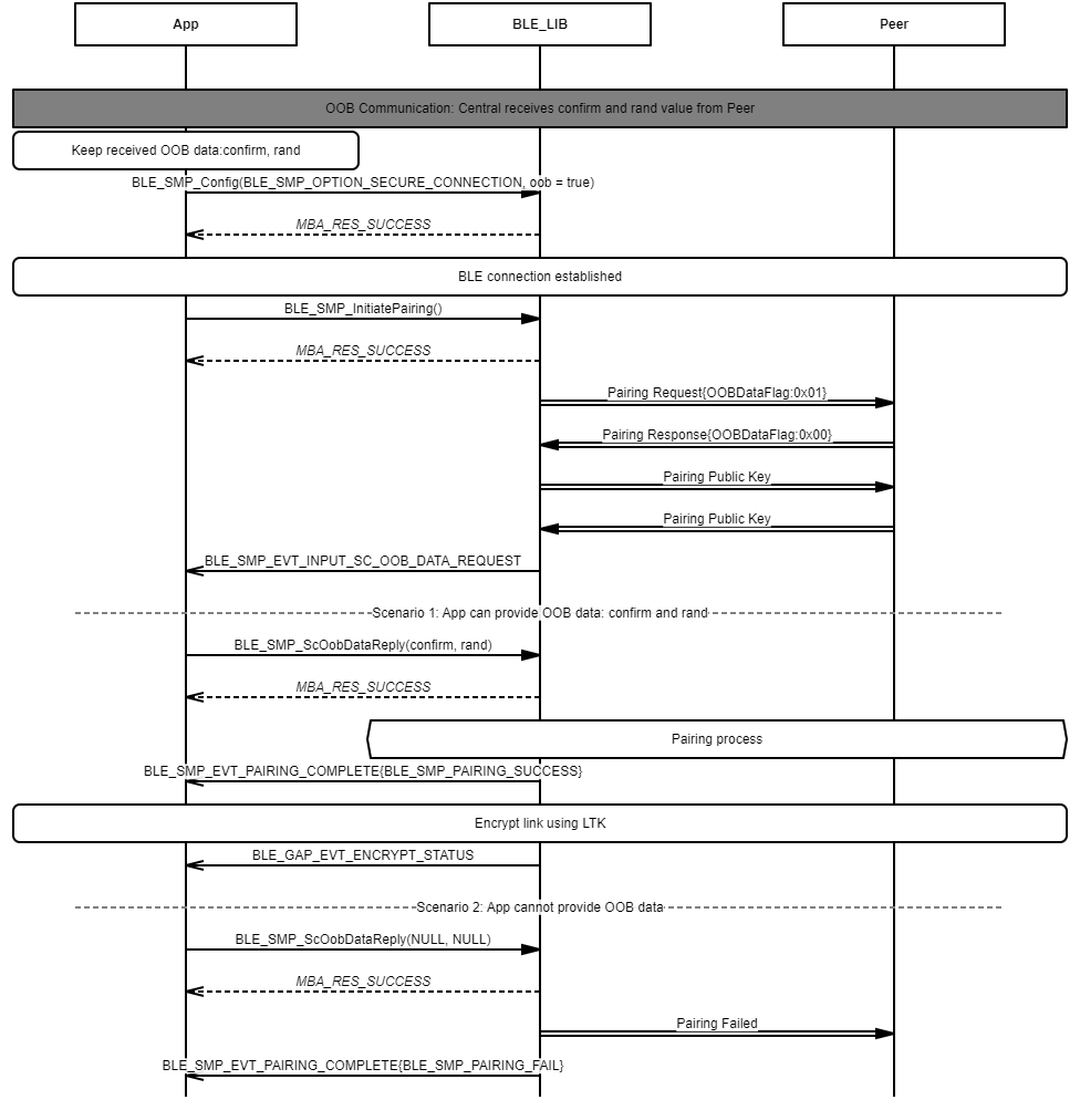 Example demonstrating SMP LESC Pairing in the GAP central role with Out-of-Band (OOB) data exchanged between Central and Peer