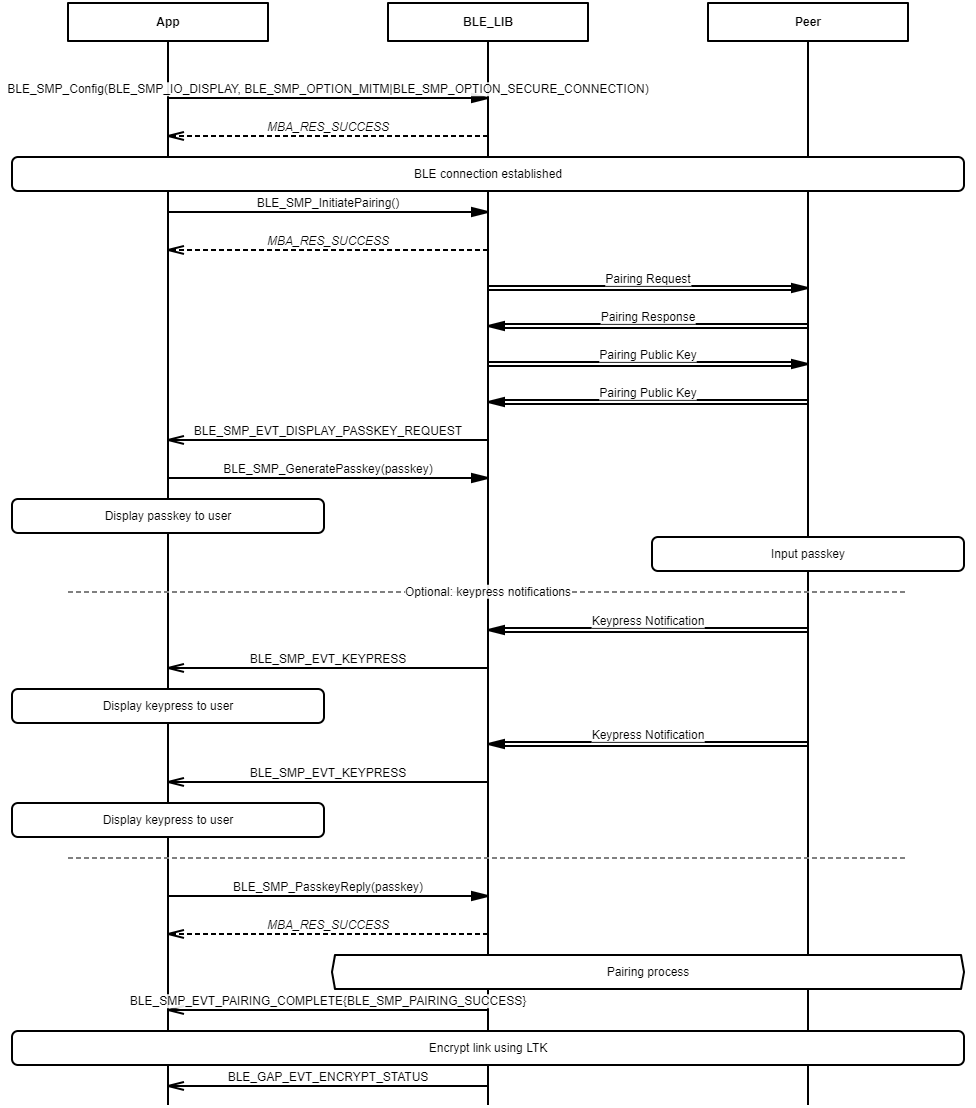 Example demonstrating SMP LESC Pairing in the GAP central role with Passkey Entry, where the Central device displays the passkey
