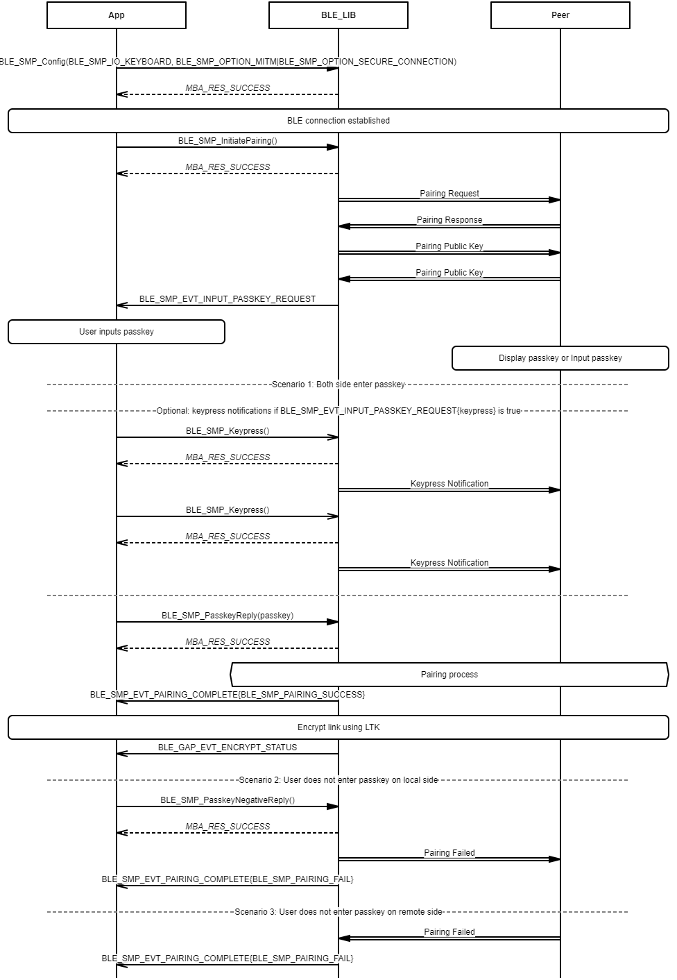 Example demonstrating SMP LESC Pairing in the GAP central role with Passkey Entry, where the Central device inputs the passkey