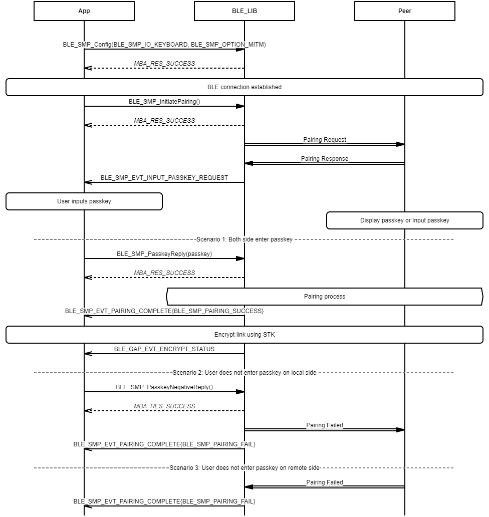 Example demonstrating SMP Legacy Pairing in the GAP central role with Passkey Entry, where the Central device inputs the passkey