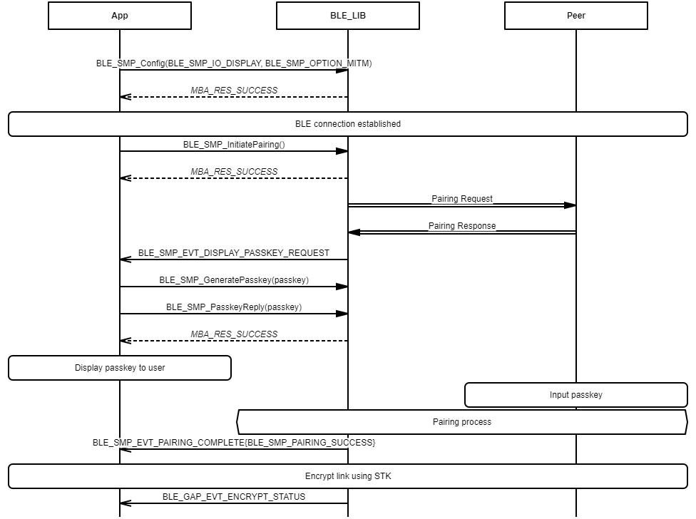 Example demonstrating SMP Legacy Pairing in the GAP central role with Passkey Entry, where the Central device displays the passkey
