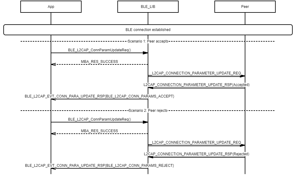 L2CAP Connection Parameter Update Procedure Example demonstrating L2CAP Connection Parameter Update procedure for a peripheral device Example demonstrating L2CAP Connection Parameter Update procedure for a central device