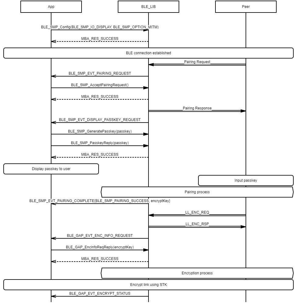Example demonstrating SMP Legacy Pairing in the GAP peripheral role with Passkey Entry, where the Peripheral device displays the passkey