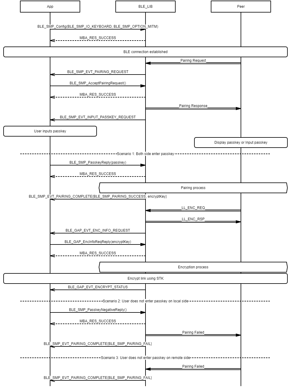 Example demonstrating SMP Legacy Pairing in the GAP peripheral role with Passkey Entry, where the Peripheral device inputs the passkey