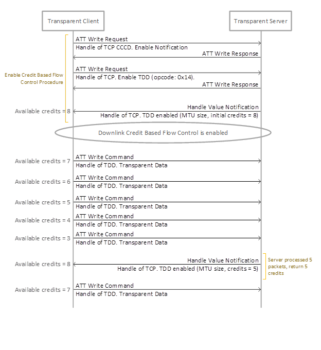 When enabling Downlink Credit Based Flow Control, Client shall write TCP characteristic handle with “Downlink Credit Based Flow Control Enable” opcode (0x14) to the Transparent Control Point on Transparent Server. And the Transparent Server shall send the MTU value and available credit numbers to Transparent Client by Response Parameters of 0x00 opcode. Transparent Client will check the credit count to know how many data can be transmitted to the Transparent Server by performing the write command operation to TDD Characteristic handle. The Credit count will be decreased by the number of ATT packet sending by Transparent Client. Transparent Client can send data only while the credit count is greater than zero. Transparent Server shall return the credit to Transparent Client after the received data has been processed completed.