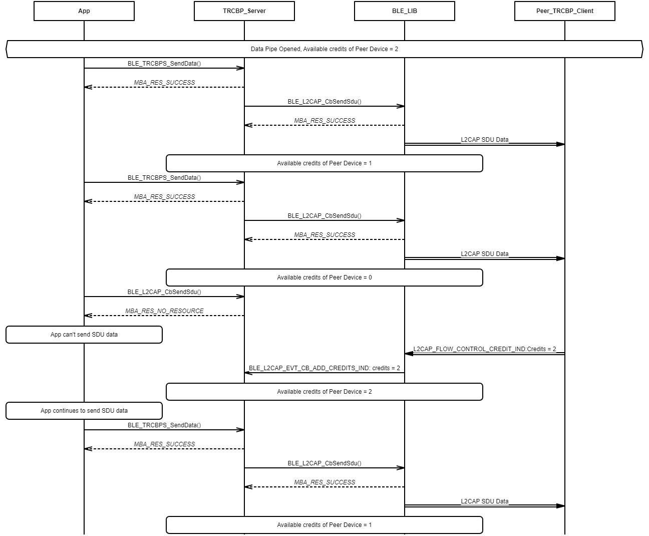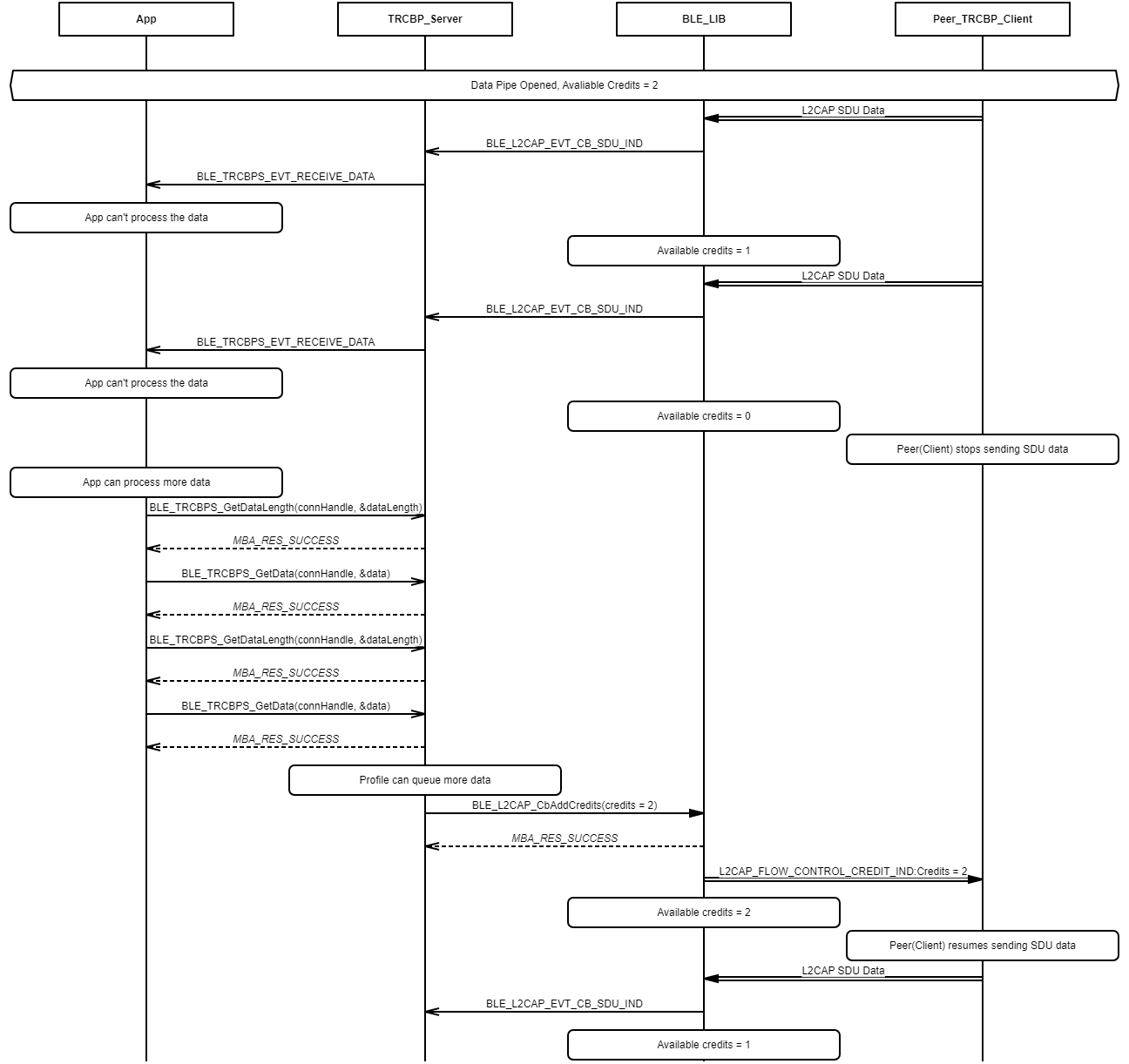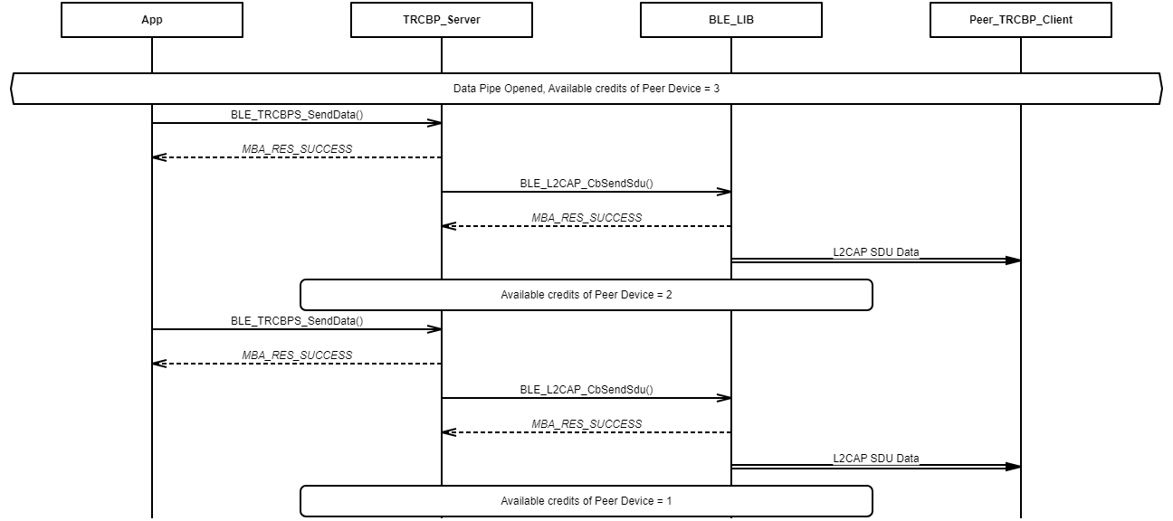 Example demonstrating client-to-server data exchange over the Transparent Credit Based Profile data pipe without available credits.