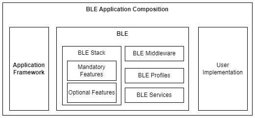 The architecture of an application encompasses its structural design and the integral components that constitute it. A standard BLE application is comprised of multiple essential elements, each fulfilling distinct roles. These elements, except for user implementation, can be broadly categorized into two segments: the application framework and the BLE. In addition, all the memory footprints listed below was calculated by configuring optimization level to 2.