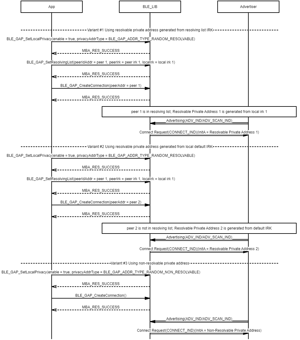 Example demonstrating the use of a resolvable private address generated from a locally stored default IRK in privacy advertising procedures
