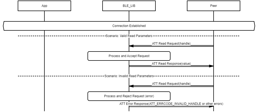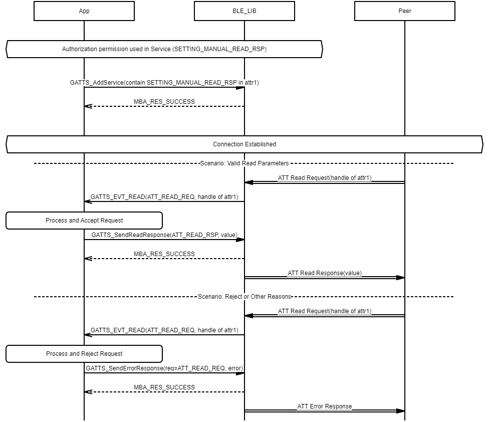 Example demonstrating peer reads of characteristic values (Handled by Application). Authorization permission is managed by setting SETTING_MANUAL_READ_RSP on the attribute.