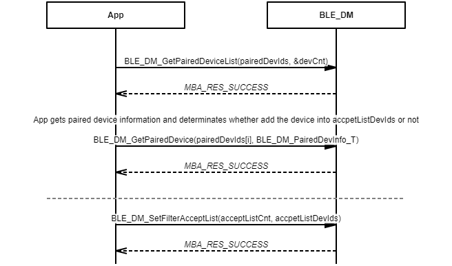 Handling BLE_DM Filter Accept List Example demonstrating the process of adding all paired devices to the BLE_DM Filter Accept List. Example demonstrating the process of adding selected paired devices to the BLE_DM Filter Accept List.
